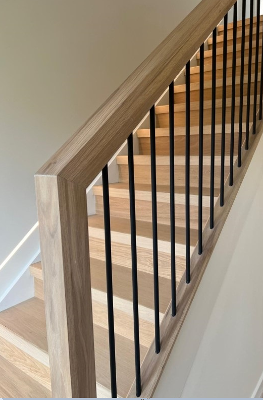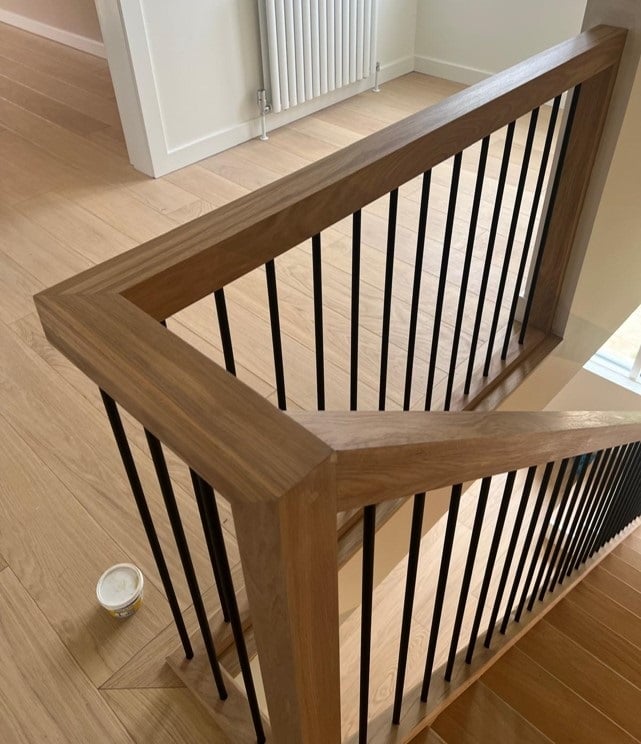 A sleek, contemporary closed string staircase showcasing the natural beauty of oak paired with bold, black Wellhope metal spindles, expertly drilled for a flawless finish. The bespoke 70 x 70mm oak handrail seamlessly integrates into the sturdy newel post formation, complemented by a slim 70mm baserail which enhances the staircase’s clean, modern lines. Featuring a 30mm square edge tread with a standard overhang, this staircase combines minimalist elegance with premium craftsmanship, making it the perfect centerpiece for any modern home. Crafted with precision and designed to impress.