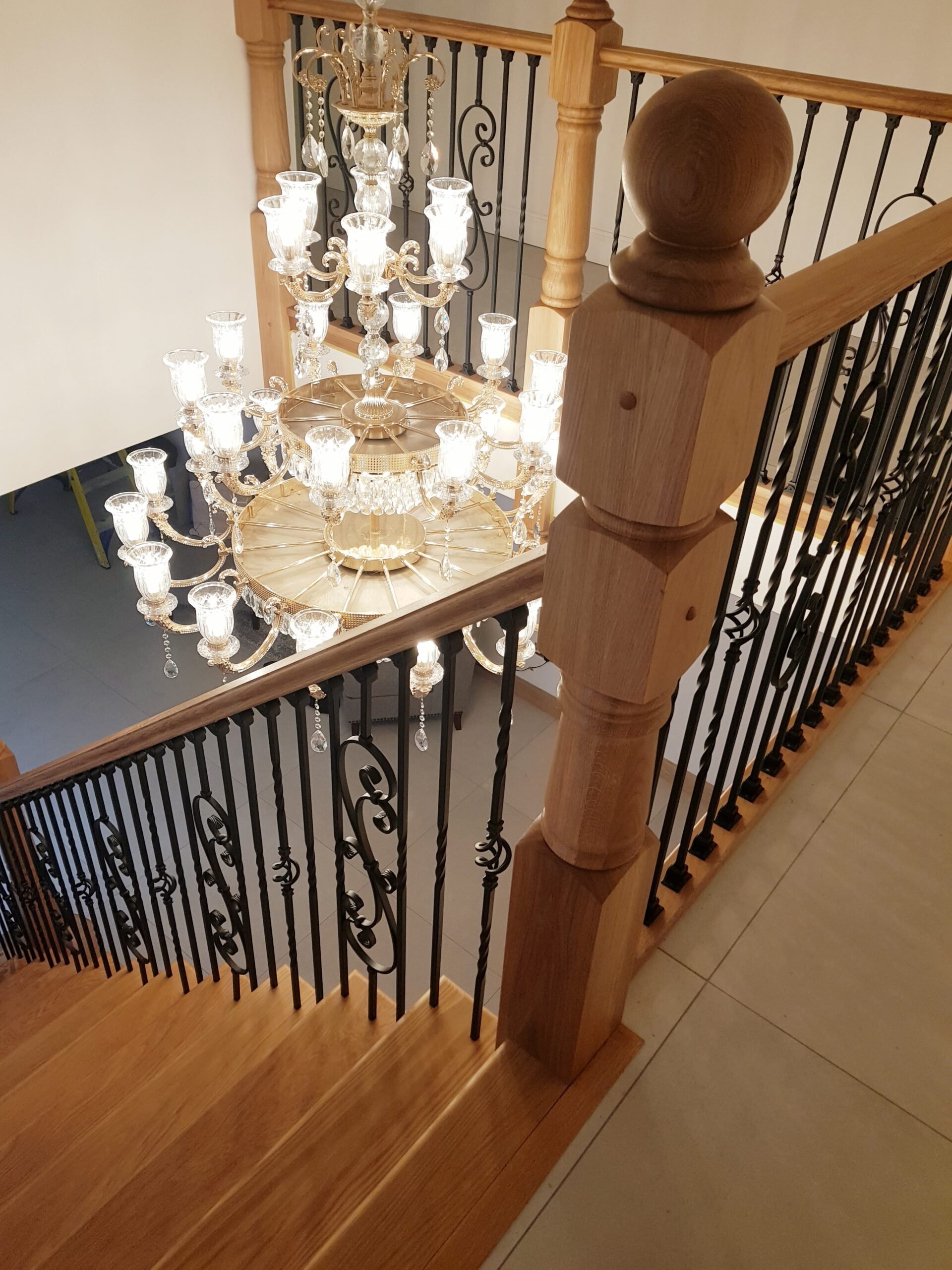 This staircase is a grand, cut string solid oak staircase that serves as a true show-stopping centrepiece, combining traditional joinery with elegant detail. Built using 140mm York oak newel posts and finished with classic Eden turned caps, this staircase opens with graceful compound handrail bends, highlighting the expert craftsmanship behind its construction. The 80 x 51mm solid oak handrail combines with a striking combination of Boltsburn, Flakebrigg, and Shambury black metal spindles, which introduce a bold, architectural contrast. Each spindle is fitted with Yewtree black metal angled shoes at the top, while the bottoms are traditionally housed into the tread, merging old and new styles with precision. With the warmth of natural oak and the crisp definition of black metal, this traditional-meets-modern oak staircase delivers timeless elegance, ideal for both classic and contemporary interiors.