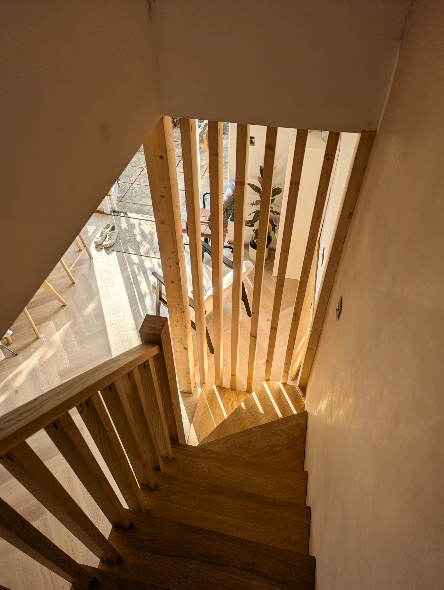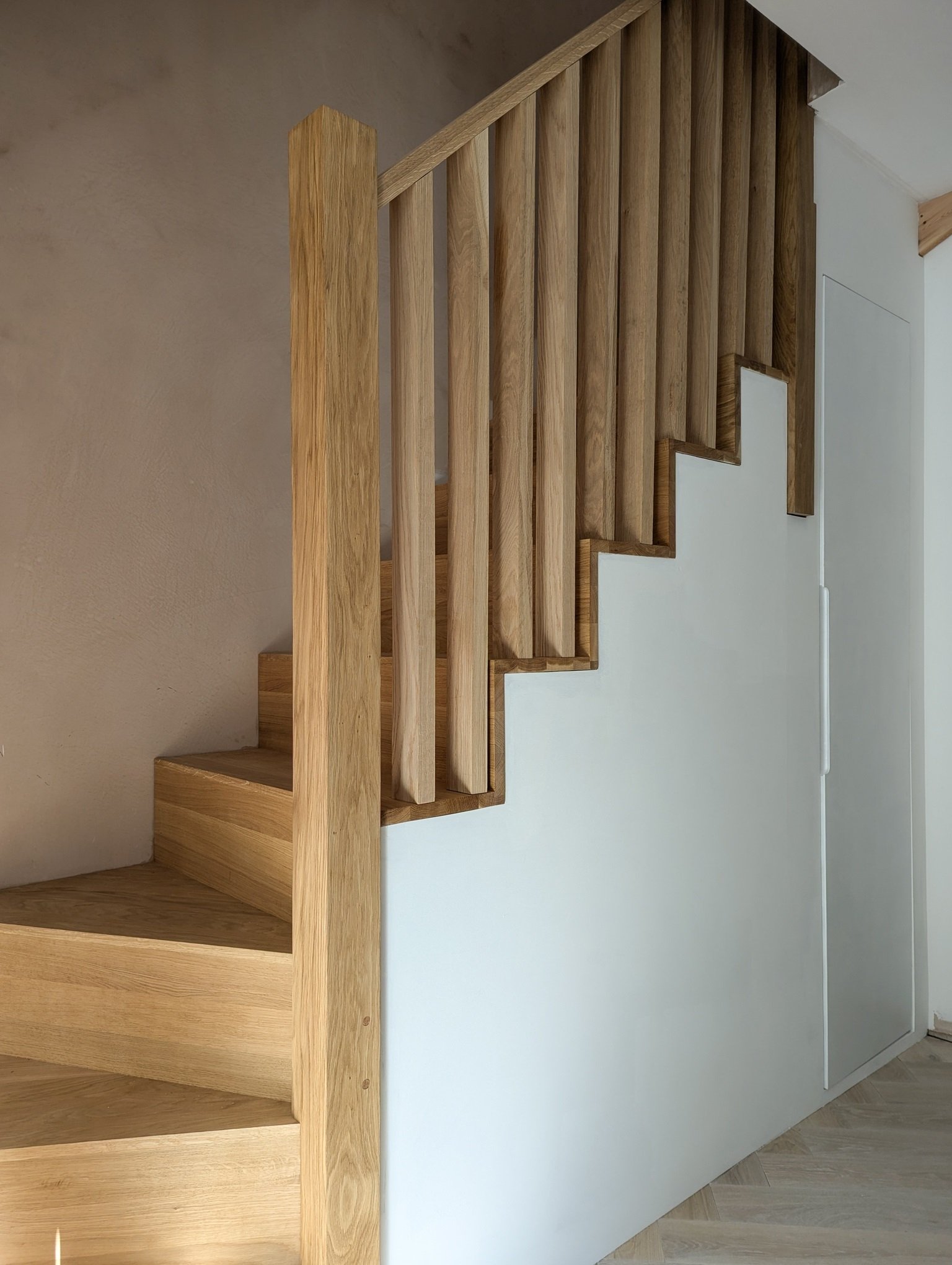 A striking example of contemporary staircase design, this oak cut-string winder staircase offers clean lines, and a modern appeal. Supplied with 90mm oak Warkworth plain square newel posts and matching Warkworth plain square spindles, it features a bespoke 70mm PSE handrail with a plain square edge for a sleek, minimalist look. The treads are designed with no overhang, enhancing the crisp, geometric lines of the staircase. Perfect for modern homes and bespoke projects, every element has been carefully selected for quality and style—demonstrating the precision and craftsmanship behind every supply.